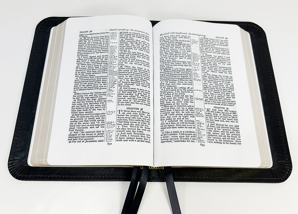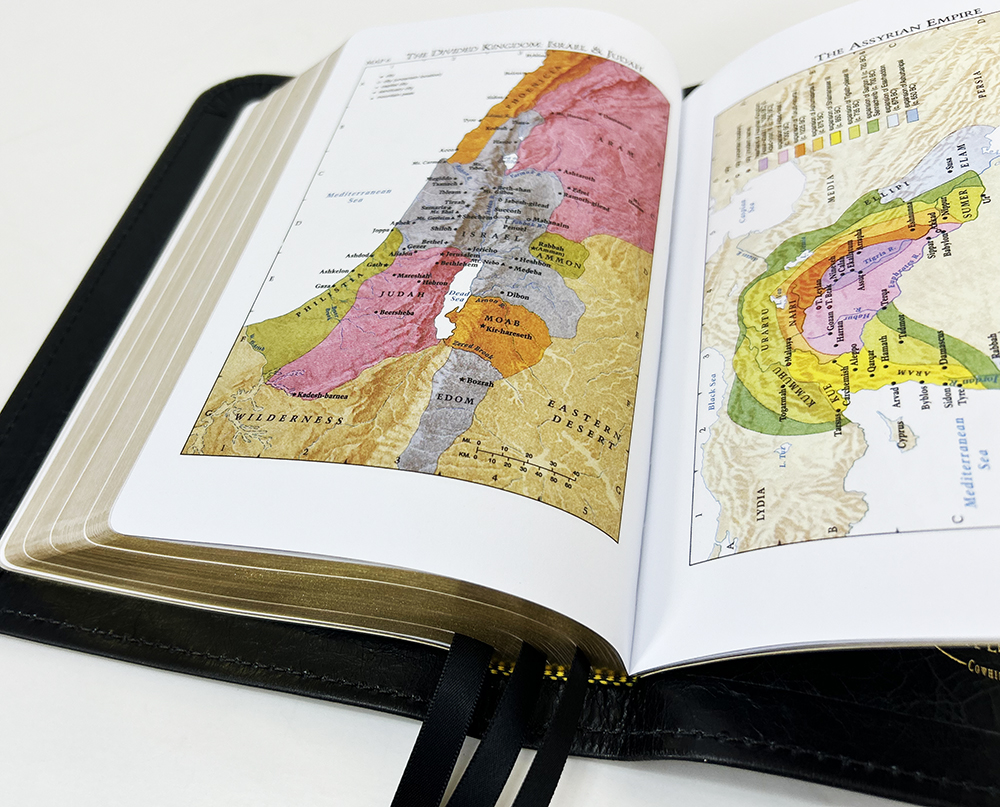 | Features | Epistle Dedicatory, Center Column Reference, Full Yapp Cover, Maps with Index, Red Letter, Self-pronouncing text, Wide Margins |